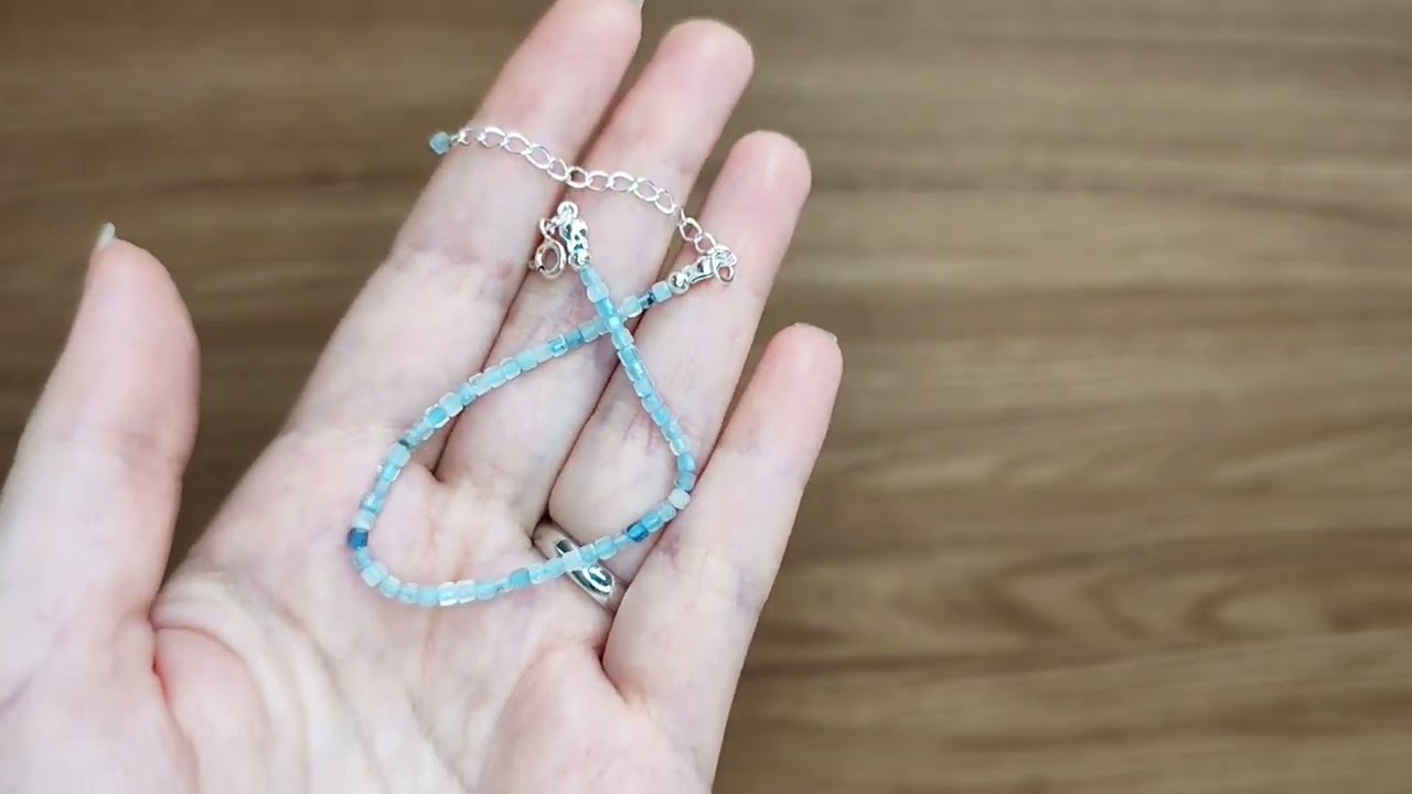 Pulseira feita com pedras naturais de água marinha (cubo, 2 mm) e detalhes em prata 925, em linha resistente e maleável, garantindo conforto e acabamento de alta joalheria.