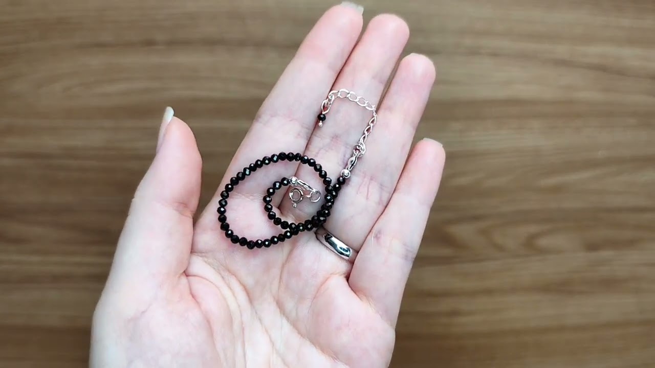 Pulseira feita com pedras naturais de espinélio negro (esfera facetada, 2 mm) e detalhes em prata 925, em linha resistente e maleável, garantindo conforto e acabamento de alta joalheria.