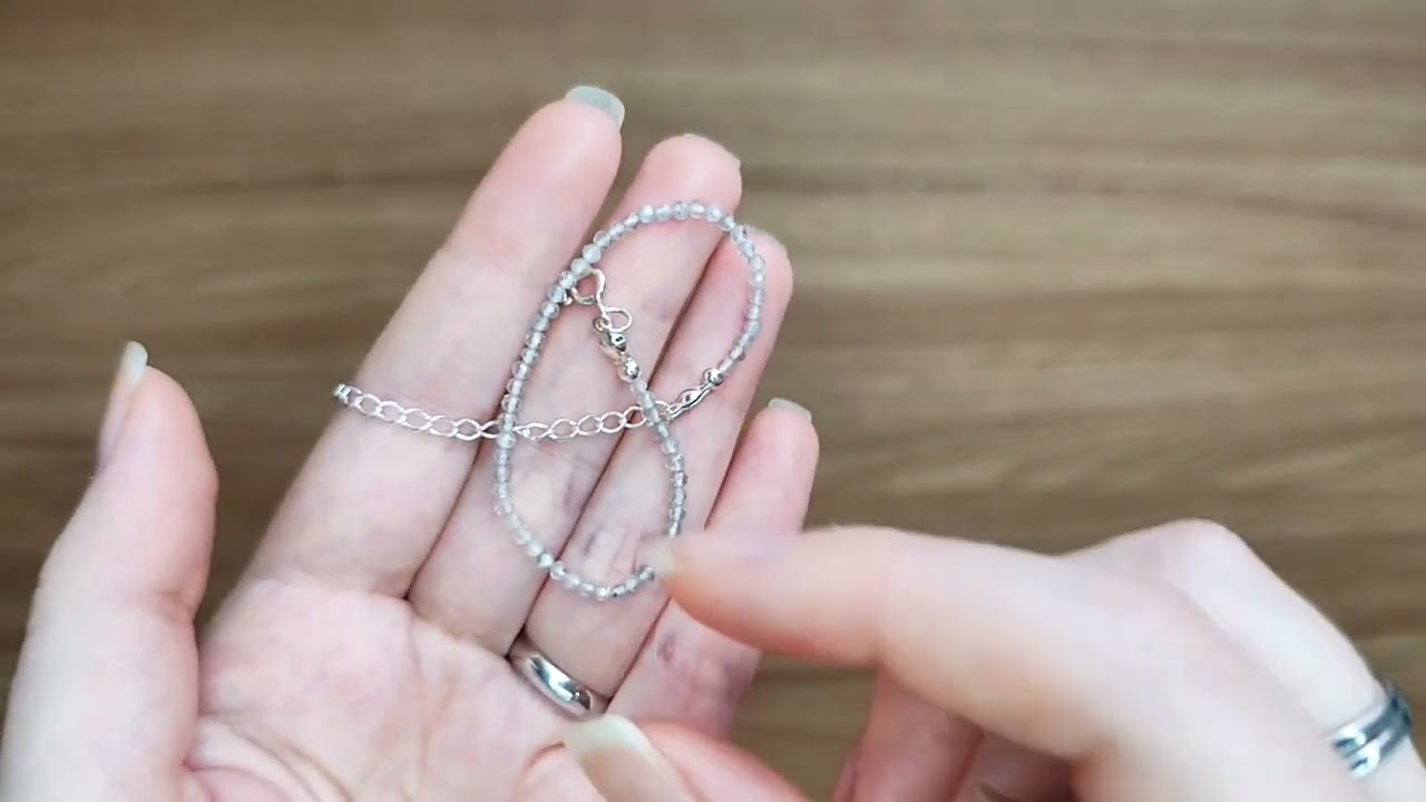 Pulseira feita com pedras naturais de labradorita arco-íris (esfera facetada, 2 mm) e detalhes em prata 925, em linha resistente e maleável, garantindo conforto e acabamento de alta joalheria.