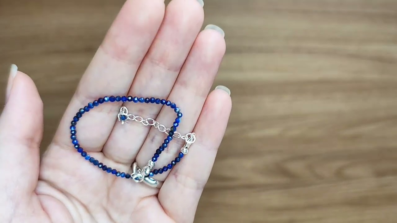 Pulseira feita com pedras naturais de lápis lazuli (esfera facetada, 2 mm) e detalhes em prata 925, em linha resistente e maleável, garantindo conforto e acabamento de alta joalheria.