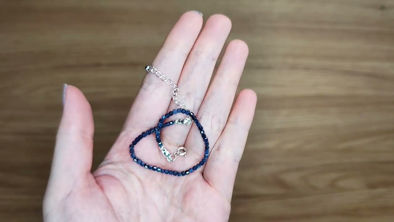 Pulseira com pedras naturais de safira (cubo, 2 mm) e detalhes em prata 925, em linha resistente e maleável, garantindo conforto e acabamento de alta joalheria.
